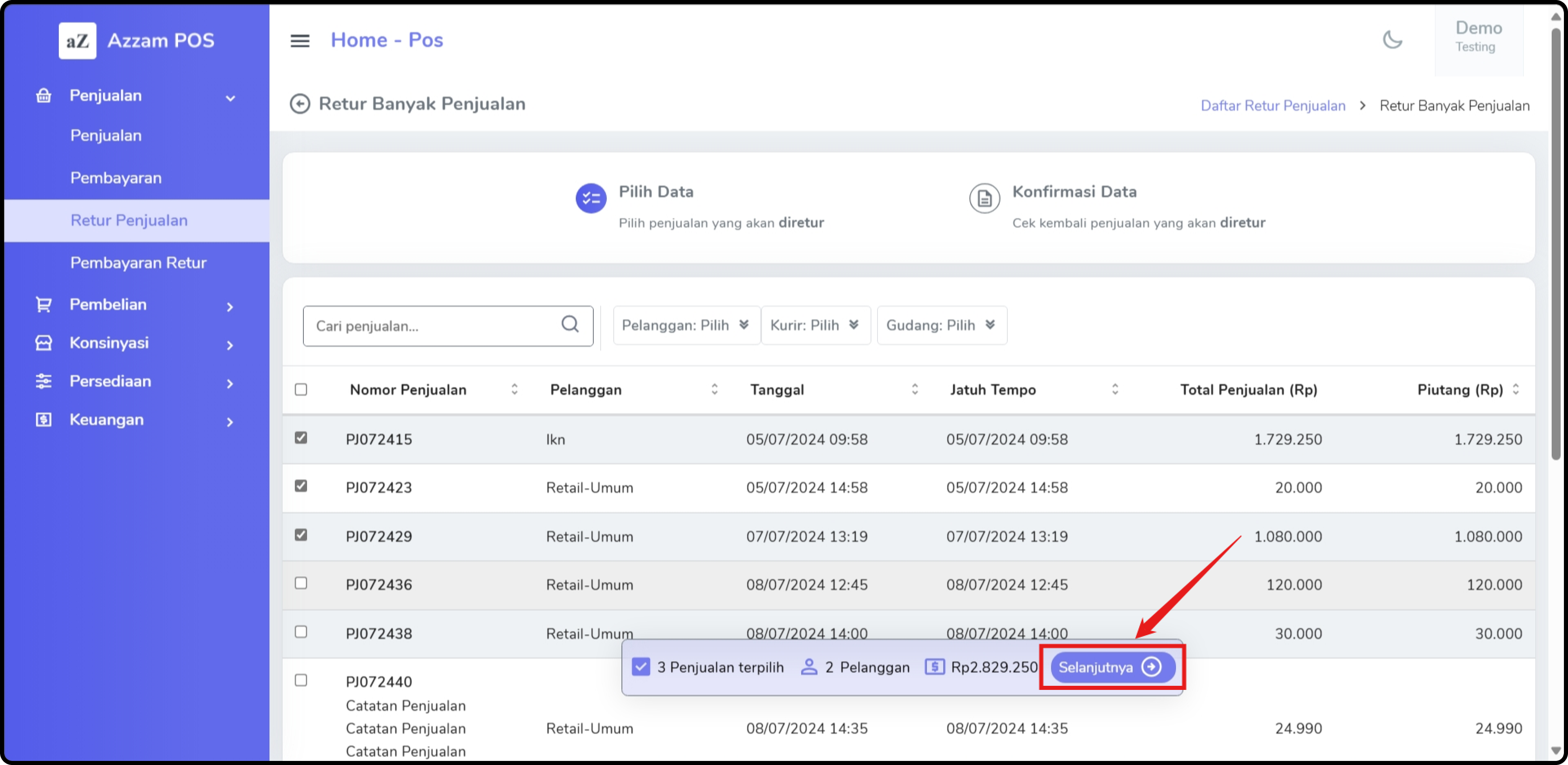 * Kemudian transaksi yang sudah dipilih bisa lanjut ke proses selanjutnya untuk verifikasi proses retur klik tombol **Selanjutnya**.<br>
