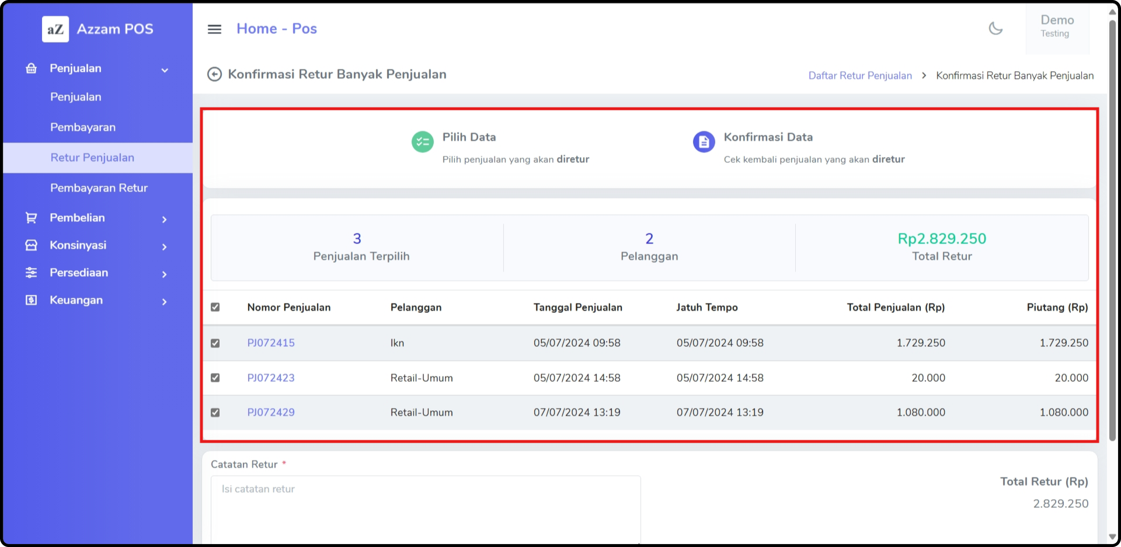* Setelah selesai proses pemilihan transaksi Anda diberi kesempatan untuk memvalidasi kembali transaksi yang akan diretur pada halaman **Konfirmasi Retur Banyak Penjualan** sebelum mengonfirmasi proses retur.<br>