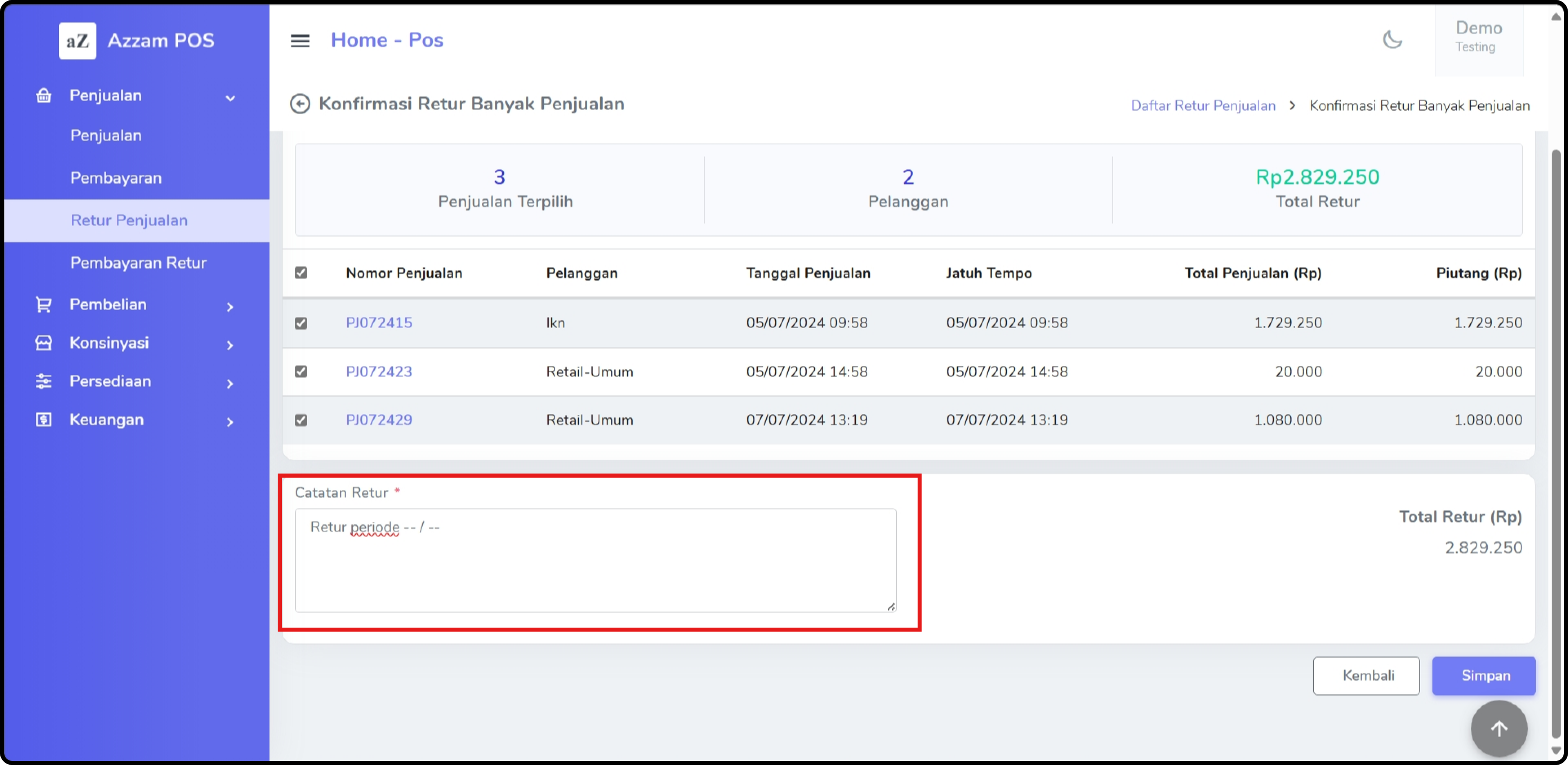 **Langkah 7 : Validasi Transaksi dan Isi Keterangan Retur**