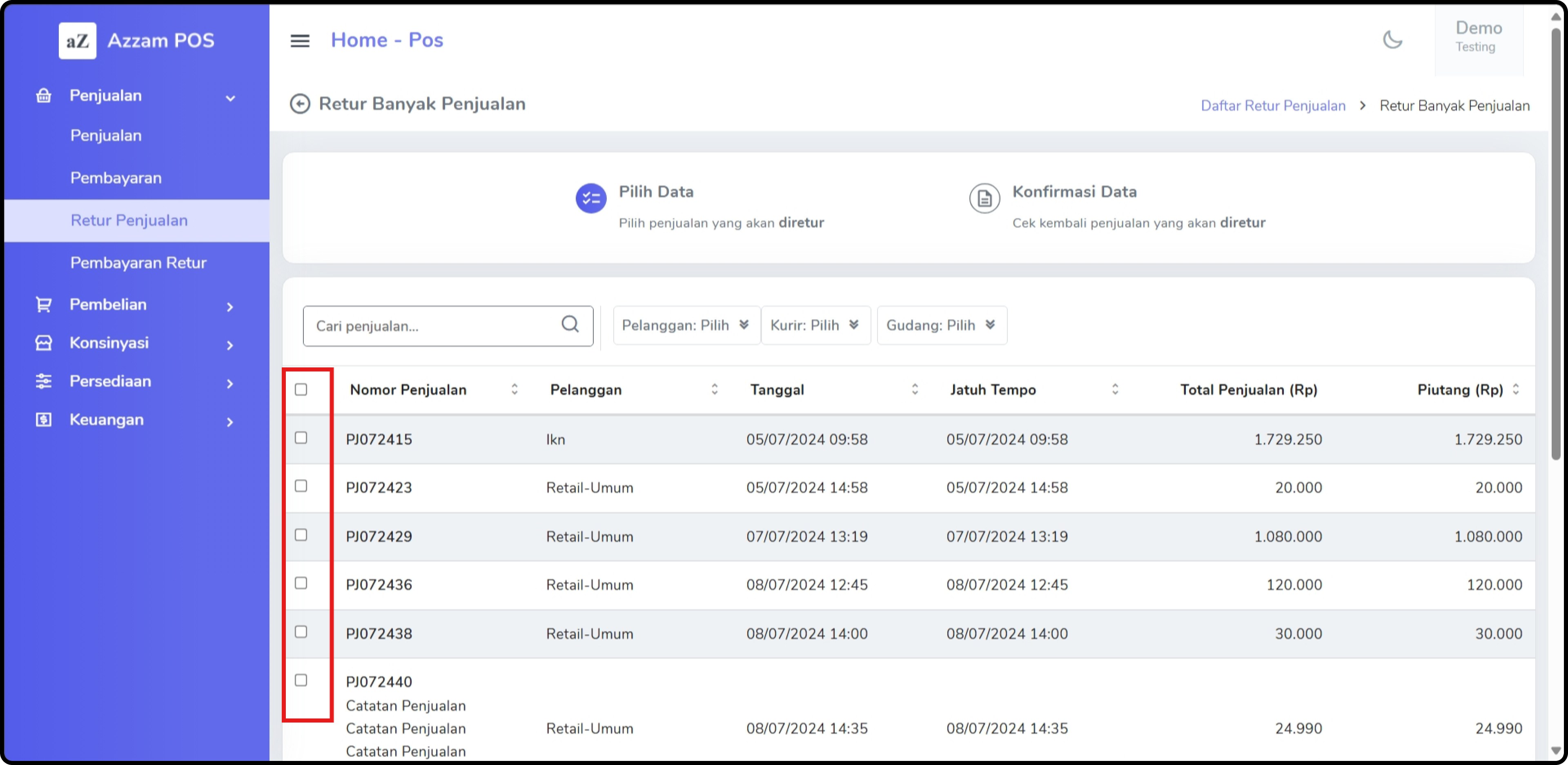 * Setelah menemukan transaksi yang akan di-retur, klik kolom centang pada transaksi tersebut.<br>