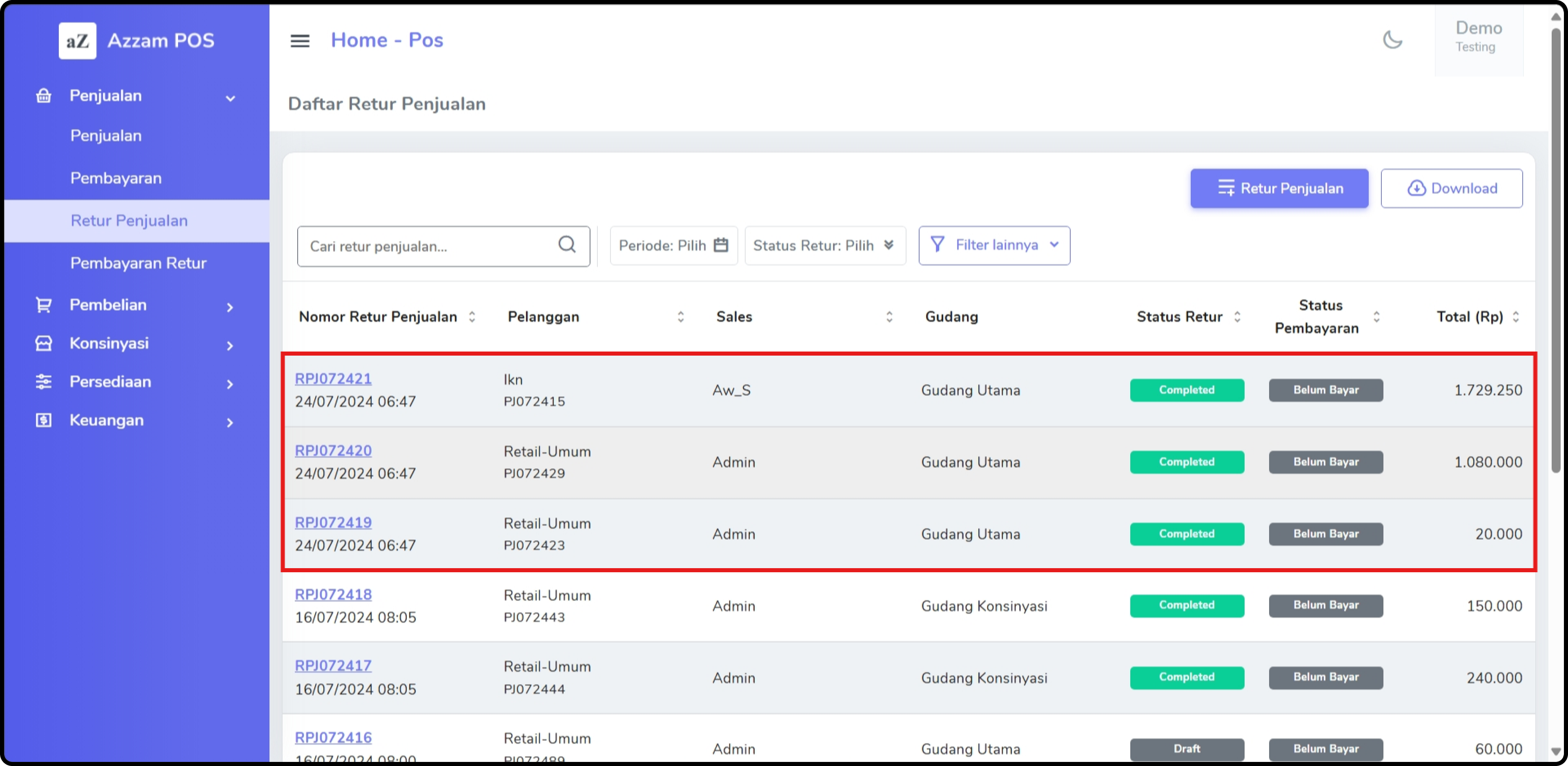 **Langkah 4 : Masuk ke Halaman Retur Banyak Penjualan**